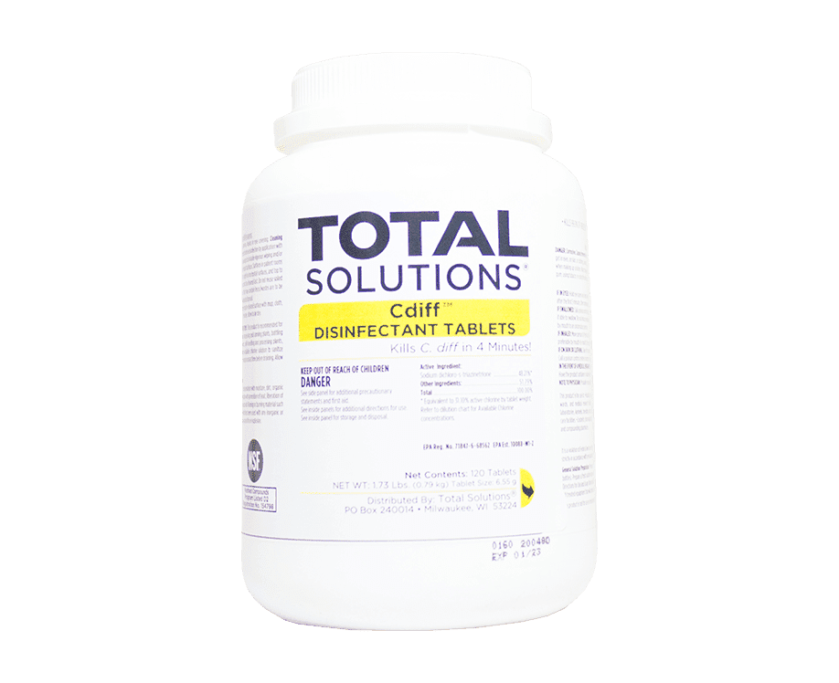 These powerful tablets utilize sodium troclosene as the active ingredient and are bleach free. Sodium troclosene is much more stable than sodium hypochlorite (bleach), and releases chlorine at a much slower rate which means that Cdiff Disinfectant Tablets produce a solution that maintains disinfecting power for 7 days, in a sealed container, and 24 hours in an open container vs. bleach solutions that become inactive after a day. With a pH of around 6, they are the perfect disinfectant for virtually any surface, including floors, in hospitals, medical offices, dental offices, clinics, day care centers, nursing homes, veterinary clinics, and more.