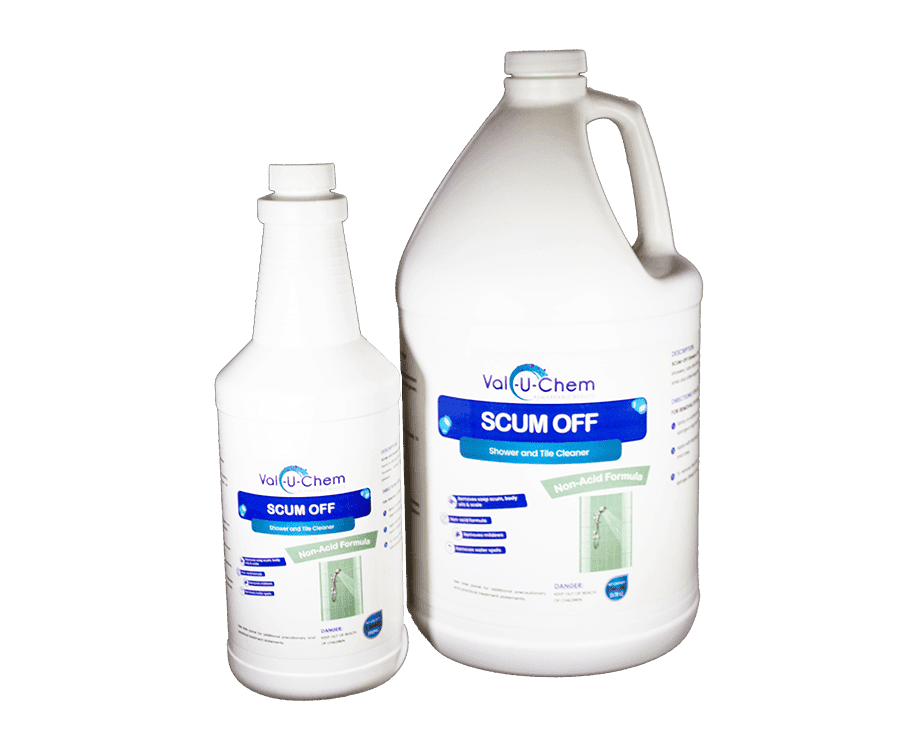 This product is formulated to remove soap scum, body oils and scale found in showers, tubs and sinks. It will remove mildew found in showers and tubs, removes water spots in water fountains, stainless sinks and other equipment where water stains and scale are present. It may also be sprayed on shower curtains in place.